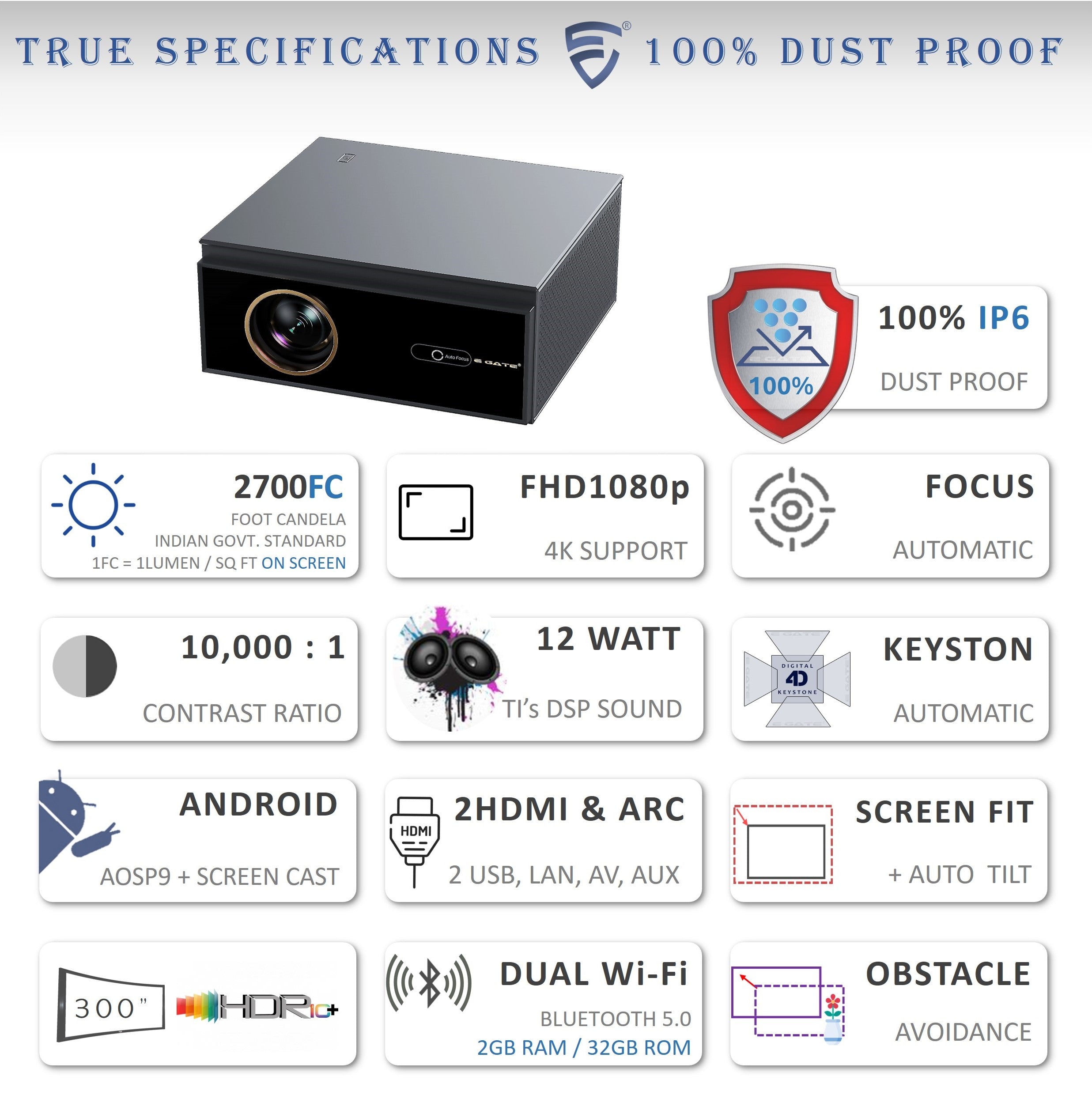ই গেট ও৯ প্রো গোল্ড ১০০% ধুলোরোধী, আল্ট্রা ব্রাইট ২১০০ এএনএসআই এবং ২৭০০এফসি, নেটিভ ১০৮০পি প্রজেক্টর ৪কে আল্ট্রা এইচডি, এআরসি সহ ২টি এইচডিএমআই, ব্লুটুথ এবং ডুয়াল-ব্যান্ড ওয়াইফাই৬, ১২ওয়াট সাউন্ড, অ্যান্ড্রয়েড টিভি, ২জিবি + ৩২জিবি