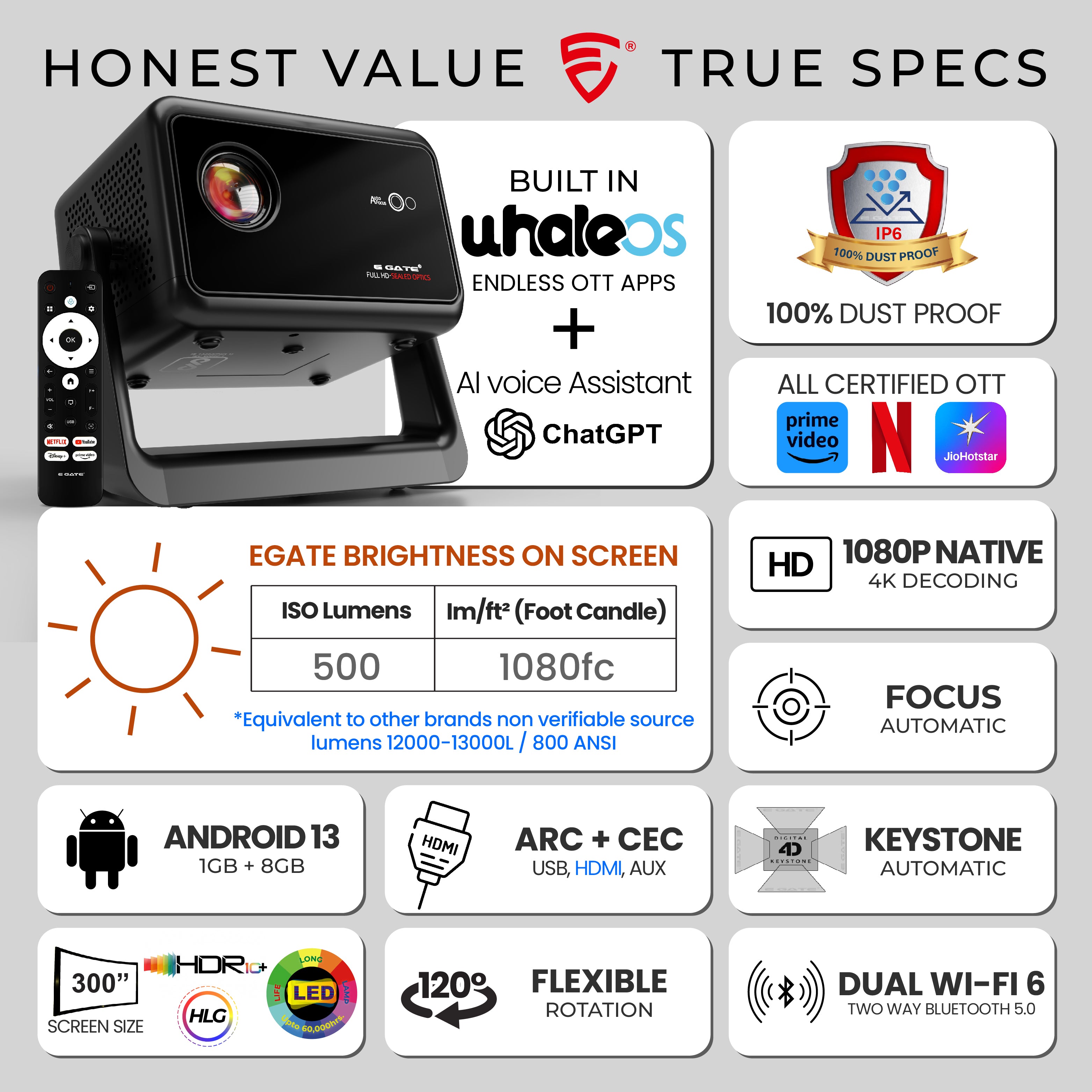 Special : Netflix, Prime Certified, Sealed Optics 100% Dust Free, HDMI ARC, Fully Automatic, Throw Ratio 1.3:1, 10 Watt HiFi Speakers, Bluetooth, USB, HDMI, Native 1080P and 4K HDR Support, Dual Band WiFi 6, Certified OS, Voice Assistant, ChatGPT Integrated.