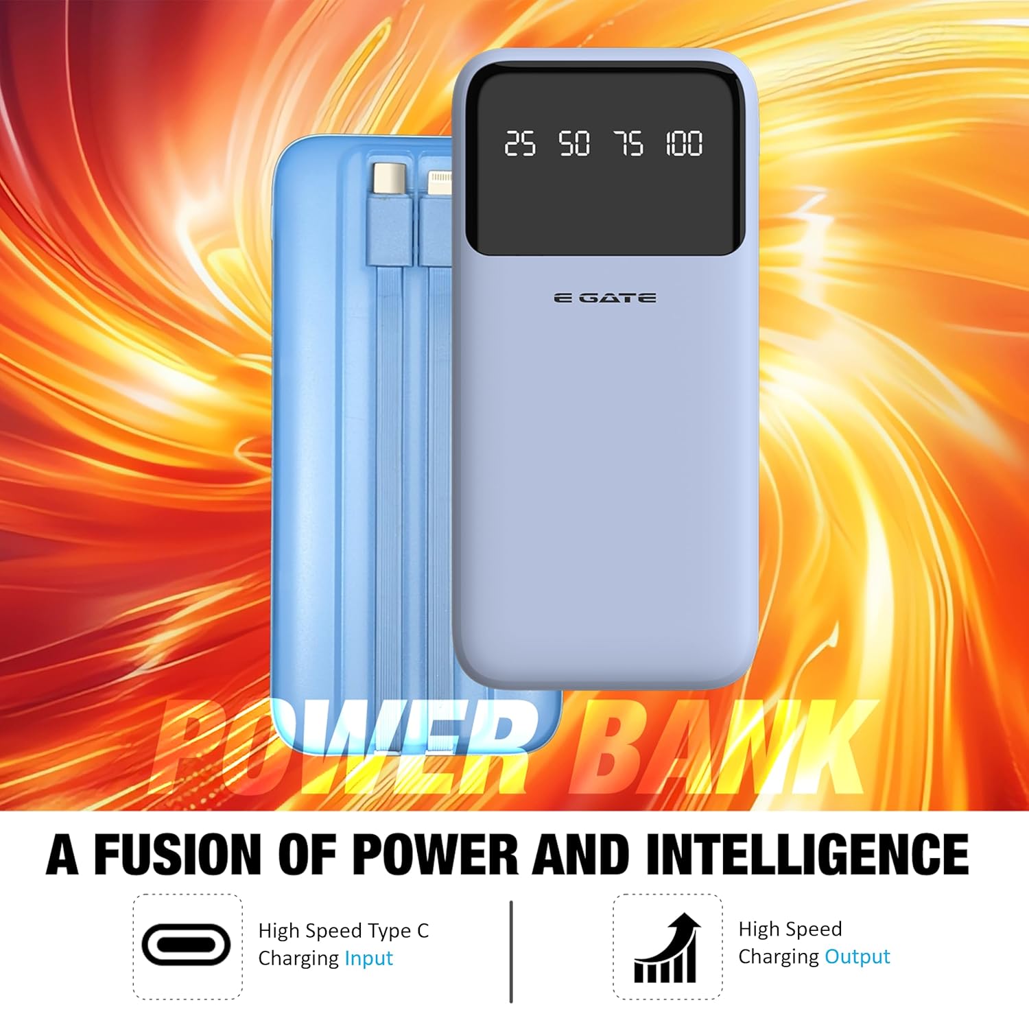 E GATE 105P Powerbank 10000mAh Fast Charging | Built-in Lightening & Type C Cable for iPhone, Android, TWS etc| Multi Device 22.5W Power Bank 5-in-1 Charger | USB X 2, Type C X 2 & Lightening (Blue)