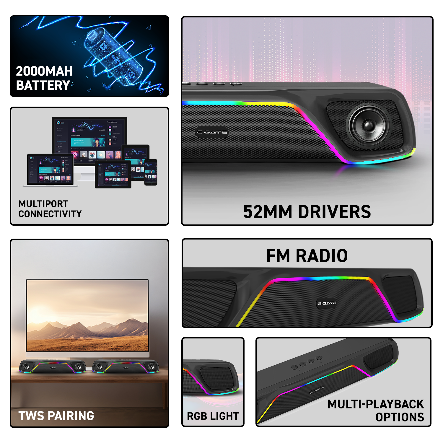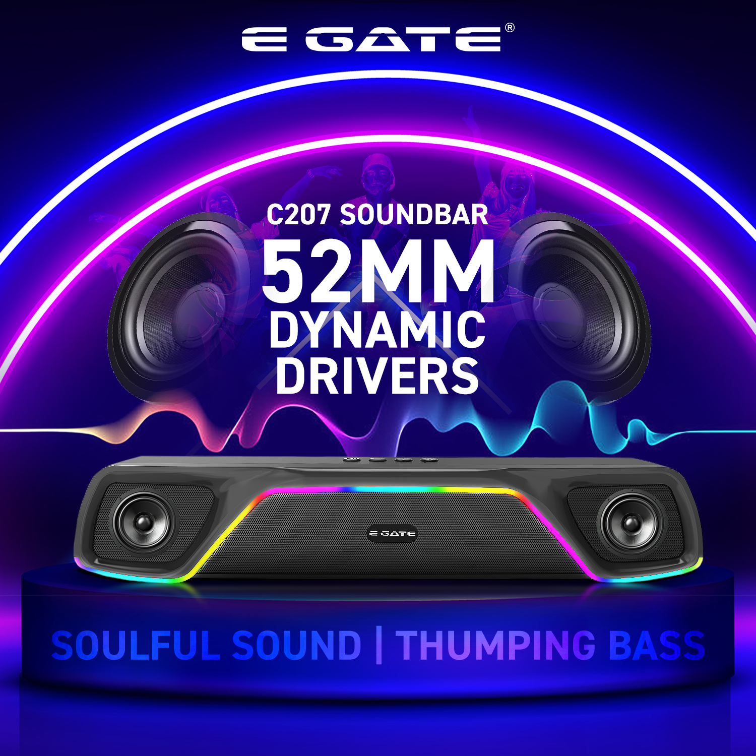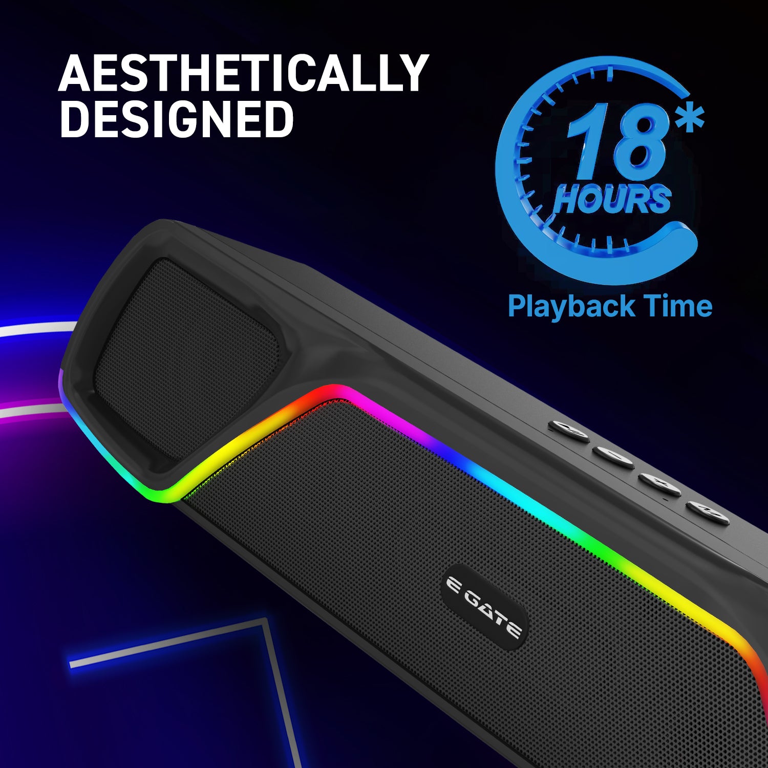 E GATE C207 |18Watt Bluetooth Soundbar, 52mm Driver, 2.0 Channel, Ambient RGB Light, Upto 18 Hrs* Backup from 2000 mAH Battery, Hands Free Call, TWS, AUX, USB, mSD, FM, BT 5.4v - eGate Sound bar